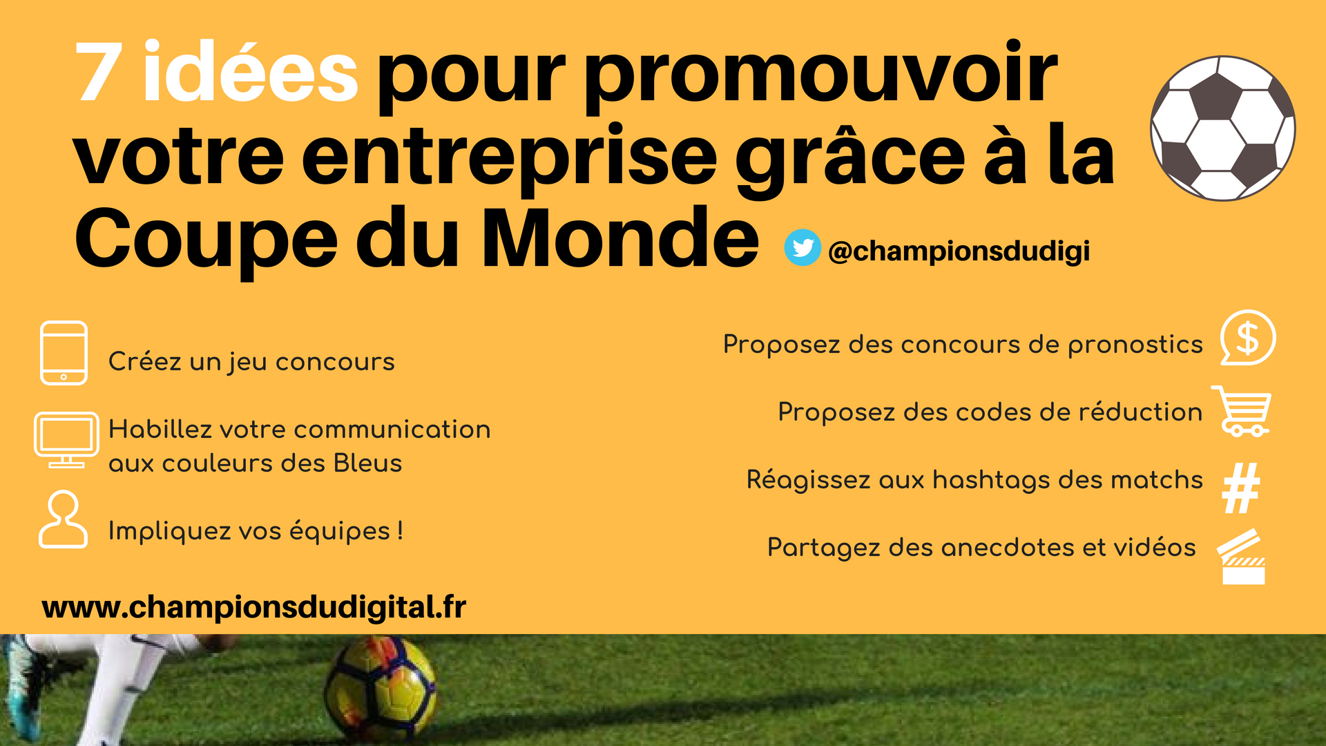 Le sport c’est avant tout de l’émotion et le football arrive à fédérer tout un peuple autour d’une compétition. Si vous voulez faire parler de votre entreprise c’est le moment ! Mais attention les communications commerciales n’auront aucune efficacité pendant la Coupe du Monde. Si vous voulez faire parler de vous, lancez des actions marketing qui génèrent de l’émotion et de l’engagement de la part de votre communauté. Attention, la Coupe du Monde de football est aussi l’événement qui génère le plus de conversations sur les réseaux sociaux donc démarquez-vous ! La balle est dans votre camp !