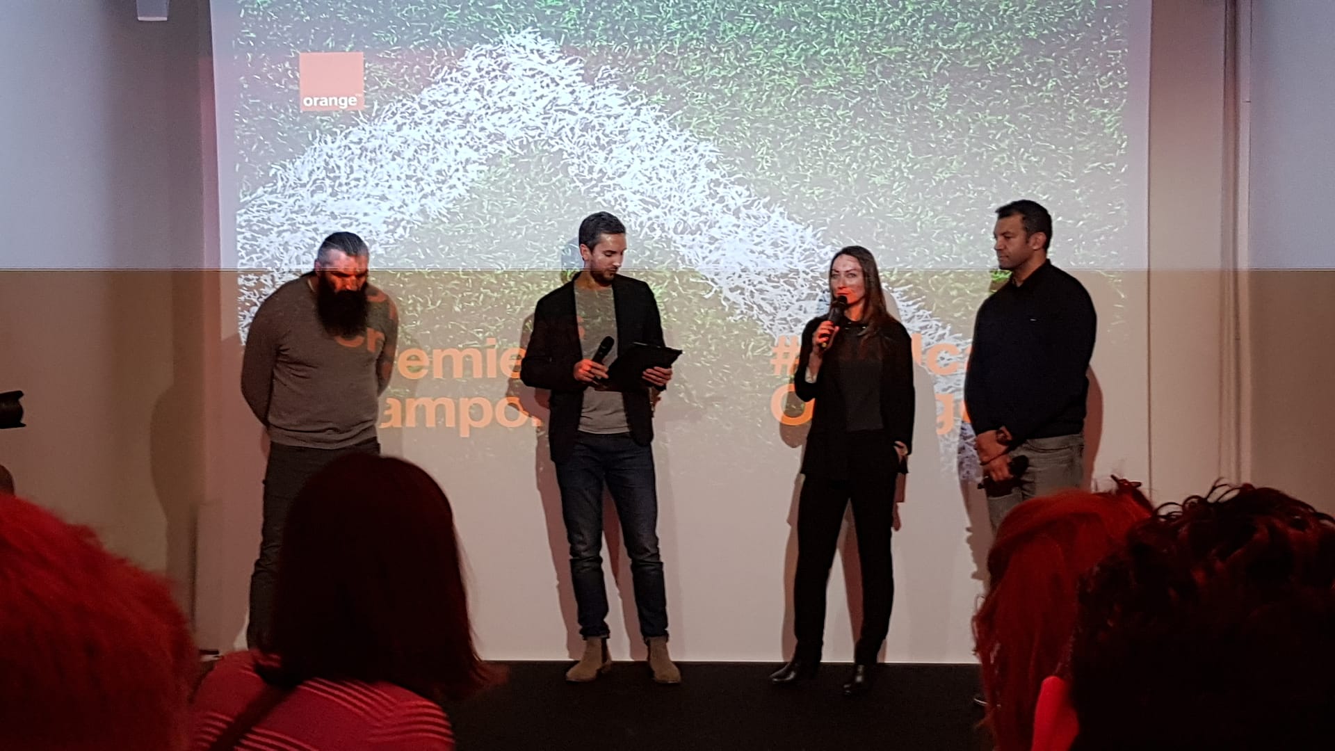 Ce soir c’est le lancement de « Premiers Crampons » qui est le premier podcast produit par Orange. C’est une série de 6 épisodes dans lesquels on interroge 6 champions footballeurs, rugbymen de la team Orange et qui racontent leur histoire sur leur activité, sur leur sport, sur comment ils sont devenus champions, championnes de football, champions de rugby. Ce sont des épisodes qui racontent à la fois comment ils sont devenus professionnels et la reconversion de ceux qui ne sont plus en activité.