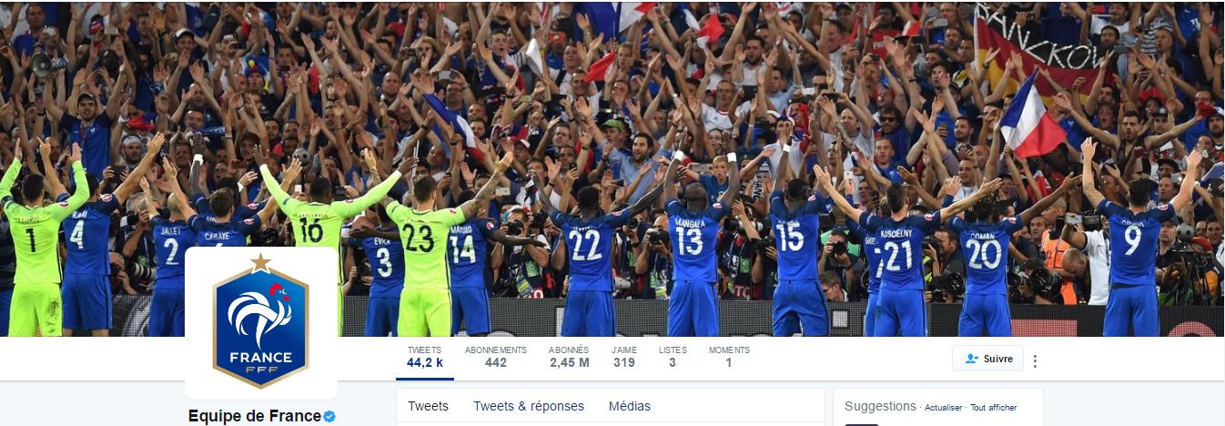 On remarque aussi que le compte Twitter de l’équipe de France relaie aussi les messages des clubs français ou internationaux dont les joueurs/joueuses sont sélectionnés en Equipe de France.