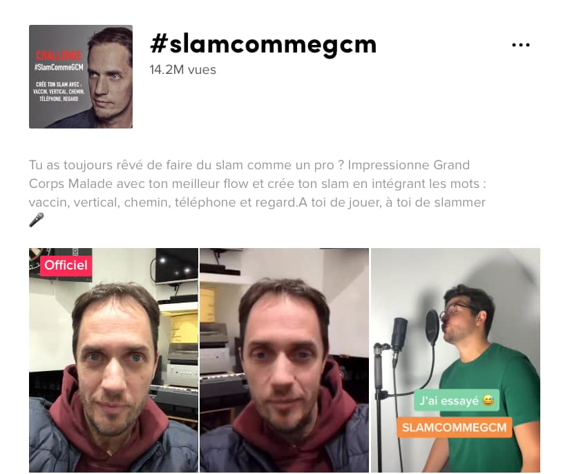 De même pour les artistes. Tiktok donne la possibilité de co-créer à l’image de ce challenge de Grand Corps Malade #slamcommeGCM