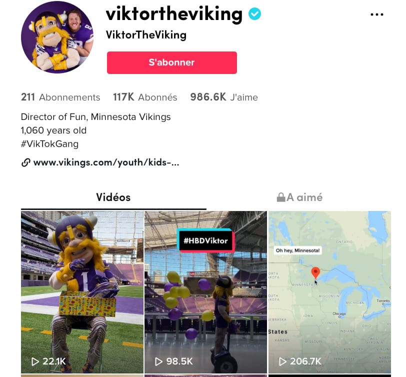 Aux Etats-Unis le club des Vikings de Minnesota a dédié un compte à sa mascotte, Viktor. Niveau créativité et authenticité, il y a de très bonnes idées à trouver sur ce compte. Quoi de mieux que faire incarner sa marque pour faire passer des messages plus facilement ? Et pourquoi pas avec une mascotte ?